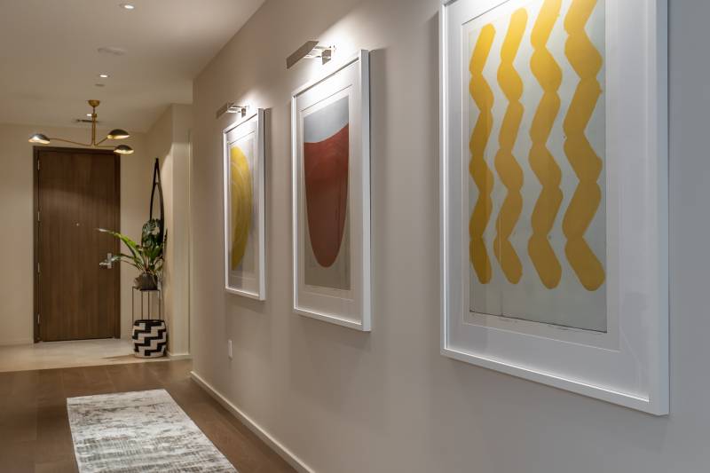 The bungalow art collection, curated by Hawaii-based Art Consultant Kelly Sueda includes original works by Robert Kelly in the living room; colorful woodblock prints by Japanese printmaker Sy Kuoko along the entry hallway; and photography by Max Wanger in the media/entertainment lounge.