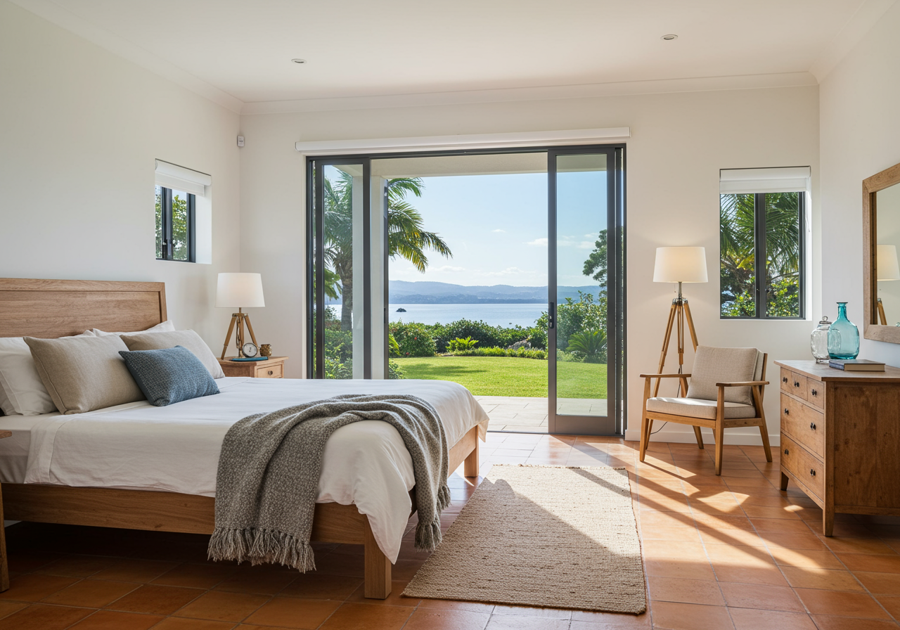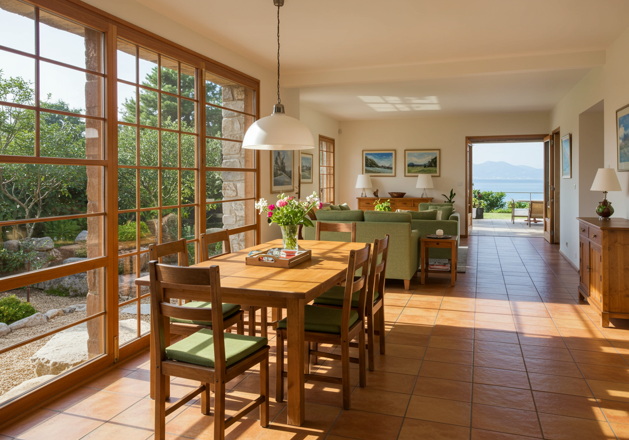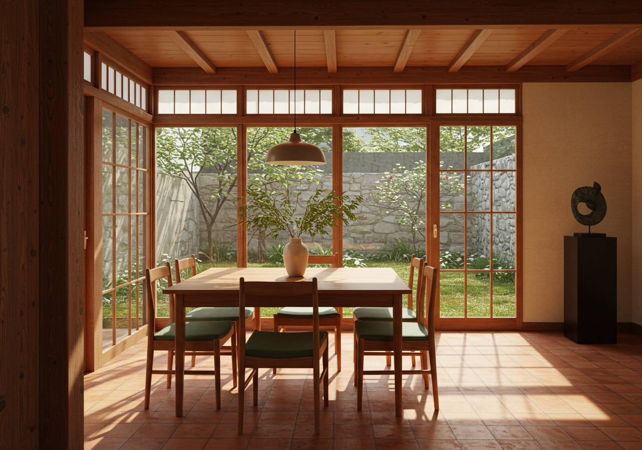 The large dining room features Japanese-inspired sliding doors to the garden. To the left of the entry is the bedroom wing with two guest bedrooms sharing a bath and the primary bedroom with its large bath and walk-in closet, overlooking the waterfront.