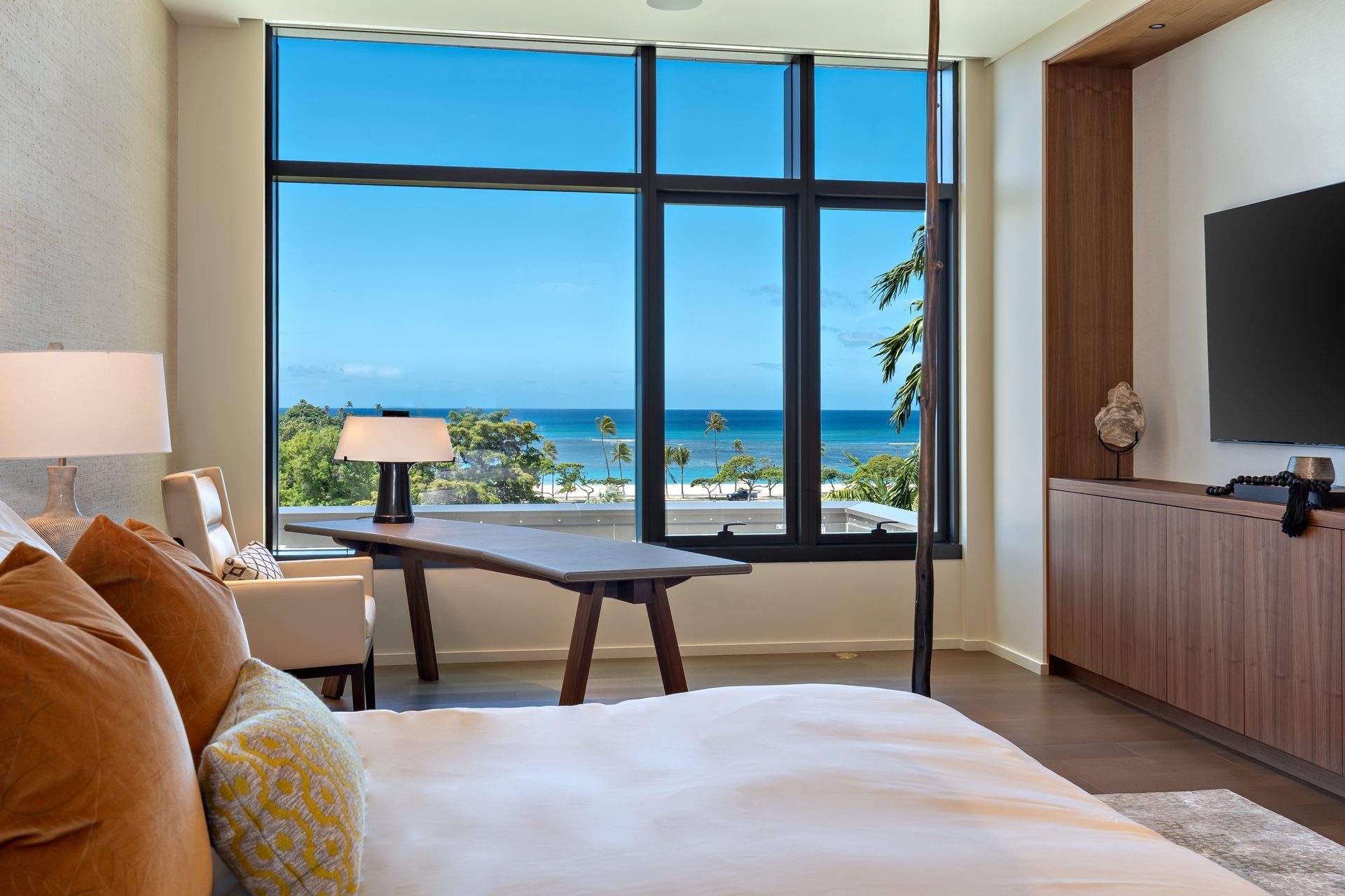 Interior design with custom millwork, hand-selected furniture, architectural-decorative lighting and textile installation was executed by Philpotts Interiors, Honolulu’s own award-winning luxury design firm. For visual interest, Philpotts layered textiles throughout. Specifications include built-in walnut cabinetry by Logan White, a primary bedroom walk-in closet by Poliform, plus designer light fixtures by Holly Hunt, Johnathan Browning, Bocci and Boyd.